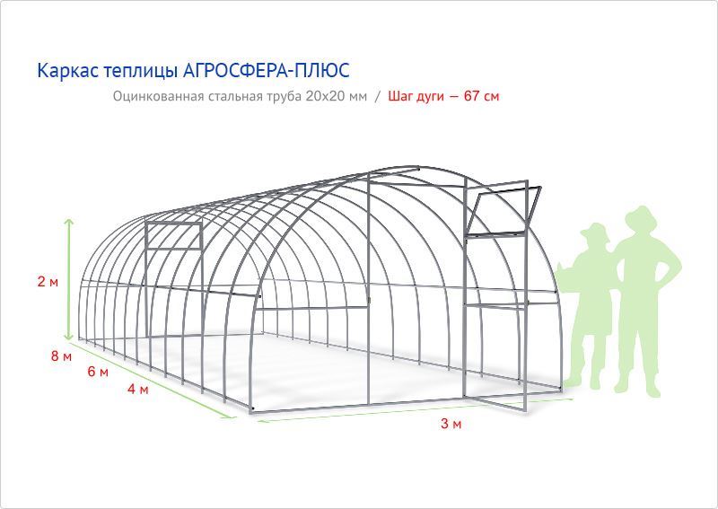 Усиленную теплицу Агросфера-Плюс выбирают те, кто ищет повышенную надёжность. Практичная и эстетичная Агросфера-Плюс имеет больше дуг, чем базовая модель Агросфера-Стандарт. Преимущества такой конструкции — особая прочность каркаса и более равномерное распределение снеговой нагрузки на сотовый поликарбонат.