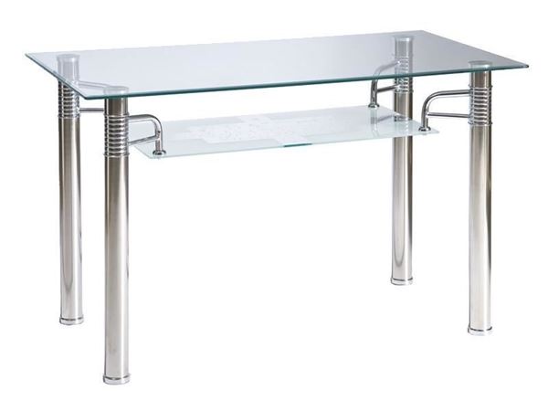 Современный обеденный стол RENI A 65X120 SIGNAL в простом дизайне. Металлическая конструкция покрыта хромом, столешница изготовлена из прозрачного закаленного стекла, полка представляет собой сочетание прозрачного и матового стекла с рисунком. Стол рассчитан на 4 человек.