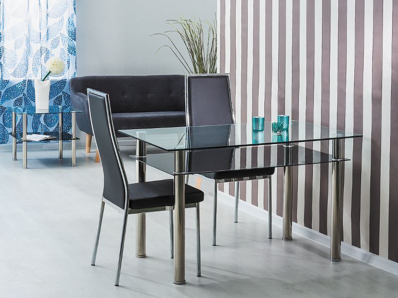 Современный обеденный стол MADRAS 120x75 SIGNAL, столешница выполнена из прозрачного закаленного стекла, под ней размещается слеклянная полка. Стол рассчитан на 4 человек.