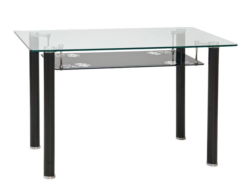 Современный обеденный стол PINO SIGNAL. Металлическая конструкция окрашена в черный цвет, столешница выполнена из прозрачного закаленного стекла, украшенного узором. Стол рассчитан на 4-6 человек.